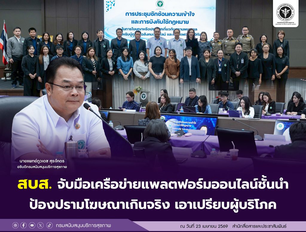 วันนี้ (23 เมษายน 2569) ณ อาคารกรม สบส. กระทรวงสาธารณสุข จังหวัดนนทบุรี นายแพทย์ภูวเดช สุระโคตร อธิบดีกรม สบส. เป็นประธานเปิดการประชุมซักซ้อมความเข้าใจและการบังคับใช้กฎหมายในการโฆษณาหรือประกาศเกี่ยวกับสถานพยาบาล สำหรับผู้ดูแลสื่อสังคมออนไลน์ และแพลตฟอร์มดิจิทัล
